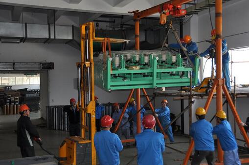 4月1日上午,在公司二工廠的廠房外圍,一臺龐大的起重機正吊起一臺設備組件往廠房二樓窗口支架的方向緩緩移動,在現(xiàn)場施工負責人的指揮下,設備穩(wěn)穩(wěn)地降落在支架的平臺上,而此時在9米高支架平臺處的設備部經(jīng)理朱永希則帶領其他人員將設備緩緩地往廠房內(nèi)的平臺處移動……
